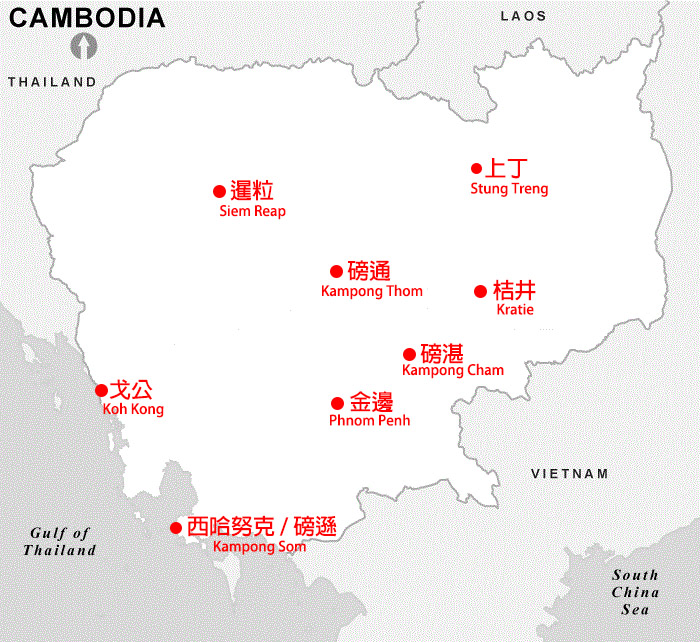 柬埔寨王國,統稱柬埔寨,位於東南亞中南半島,首都金邊,為東南亞國家協會成員國。 柬埔寨西部及西北部與泰國接壤,東北部與寮國交界,東部及東南部與越南毗鄰,南部則面向暹羅灣。柬埔寨領土為碟狀盆地,三面被丘陵與山脈環繞;中部為廣闊 而富庶的平原,占全國面積四分之三以上。